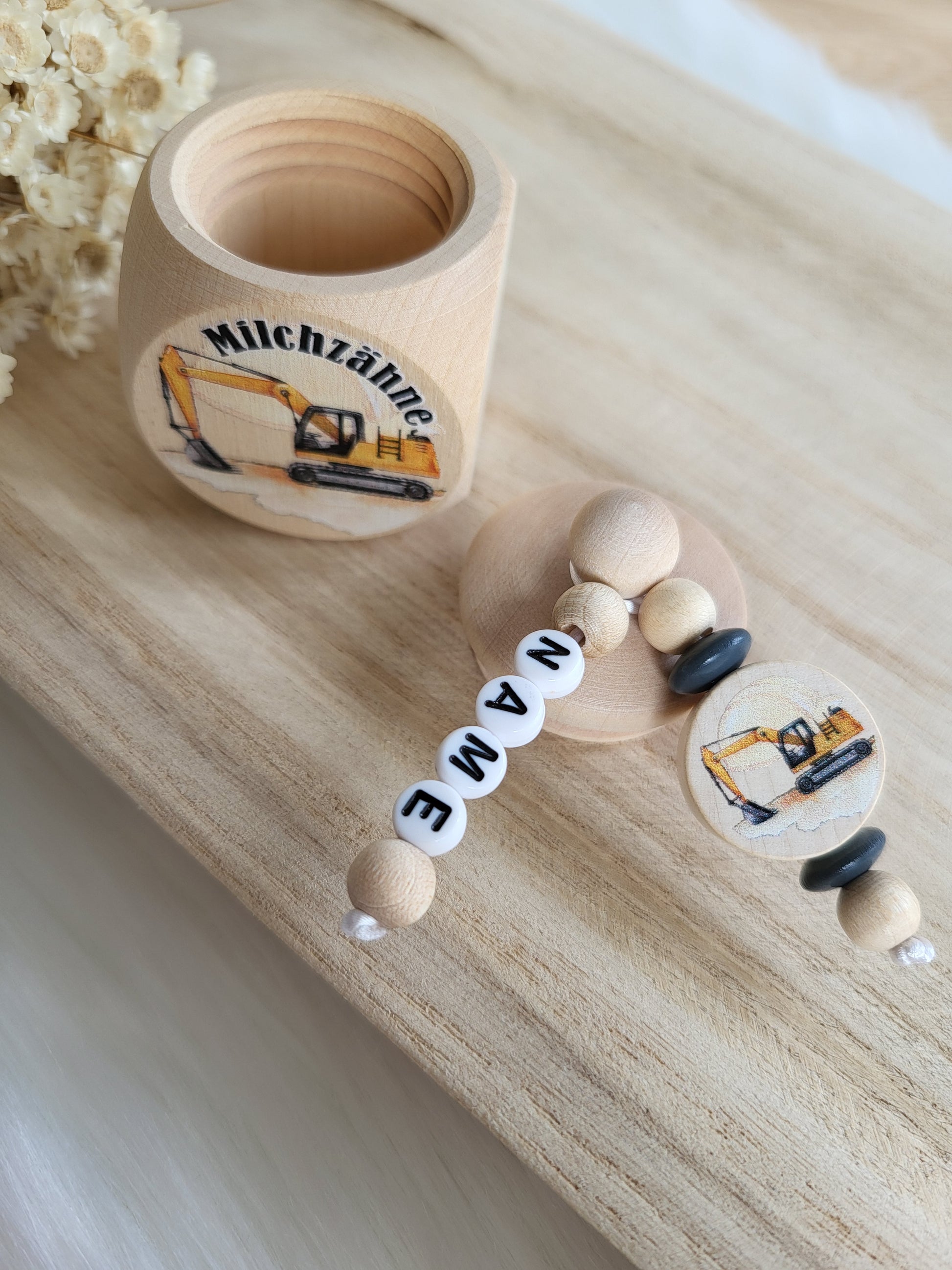 Zauberhafte Milchzahndose mit Bagger Motiv, ein muss für kleine Bagger Fans. Eine Personalisierung rundet das ganze Liebevoll ab.